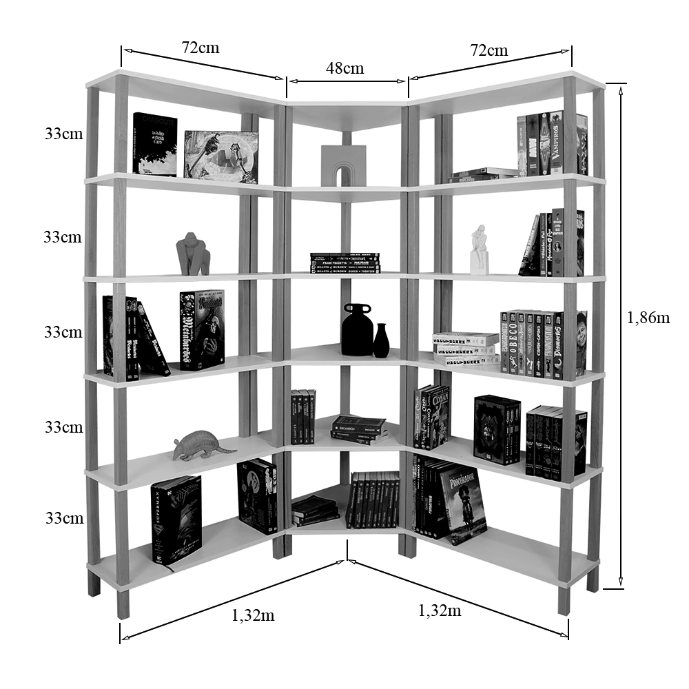 Cinco prateleiras com 33cm de altura (espaço ideal para encadernados americanos, europeus e outros quadrinhos maiores). |