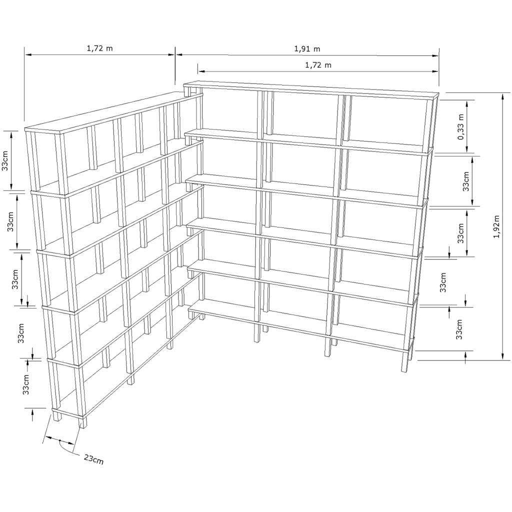 1,72m Largura x 1,91m Profundidade x 1,92m Altura - Profundidade das prateleiras - 23cm |