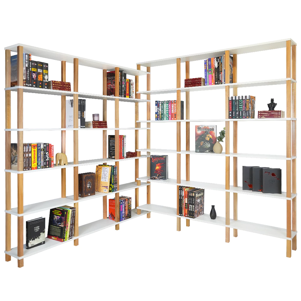 A estante de montantes Evolukit faz parte de uma linha exclusiva, com estrutura em madeira maciça para mais resistência e durabilidade. As prateleiras são confeccionadas em MDP(Médium Density Particleboard)