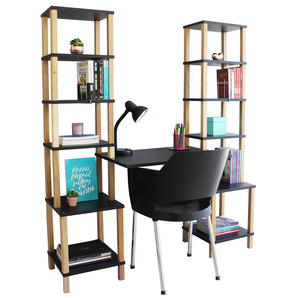 A mesa de montantes Evolukit faz parte de uma linha exclusiva, com estrutura em madeira maciça para mais resistência e durabilidade. As prateleiras são confeccionadas em MDP(Médium Density Particleboard)